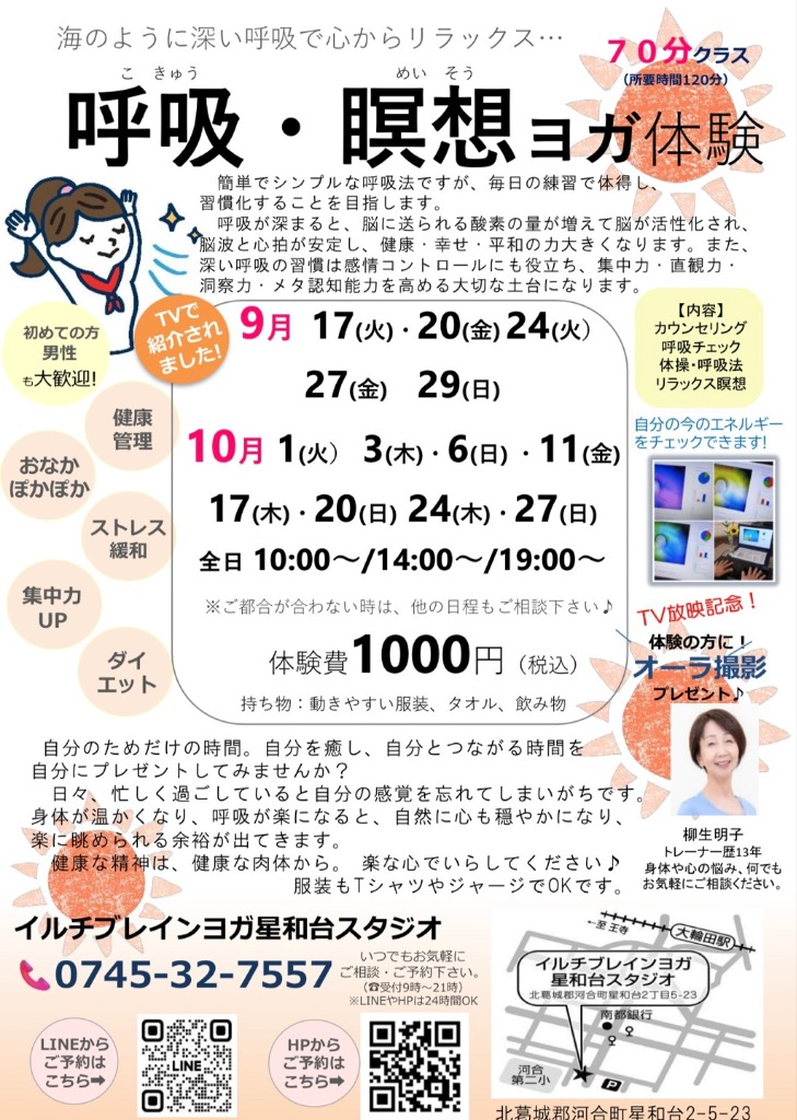 ☎0745-32-7557 イルチブレインヨガ星和台スタジオ